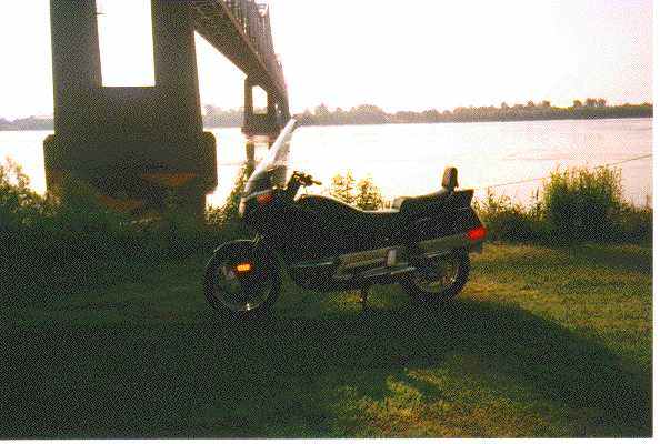 At approximately 7:30AM I rolled the PC back onto highway. It felt great to be back on board. The odometer showed 5,220 miles. Even though I’d ridden a little over 400 miles the day before I felt no fatigue and had no "saddle sores". The PC is great bike! The most direct route home would have been a straight shot for Memphis but I wasn’t too keen on fighting the big city traffic. I elected to cross over into Mississippi and by-pass Memphis all together. I pointed the PC towards Helena, AK where I would cross the big muddy. A little more than an hour later, I shot a photo of the PC underneath the Helena Bridge with the river as a backdrop. Might just put this one on my wall. Photo On the way I stopped to offer help to a couple stranded by their Harley. This was an older shovel head with flames painted on the tank, raked front forks and "ape-hanger" bars. I offered to give one of them a ride to get help but they declined; probably didn’t want to be seen on a scooter!