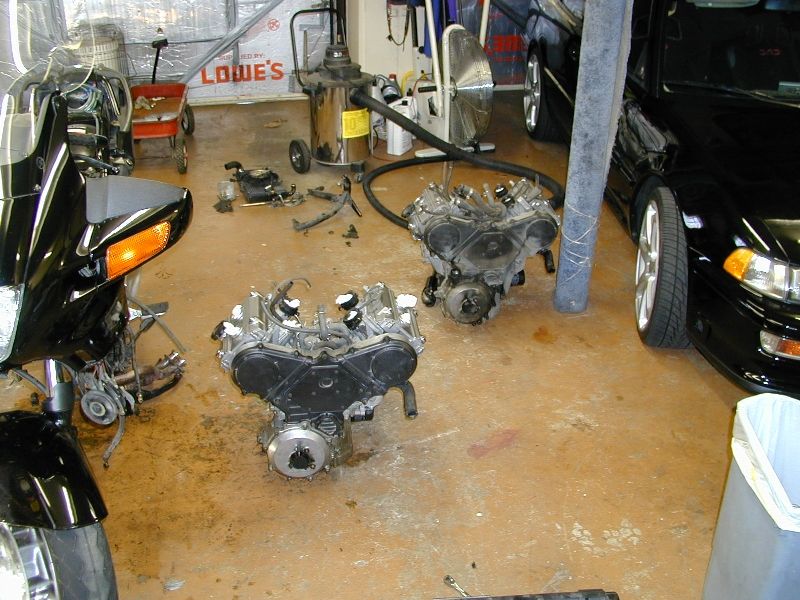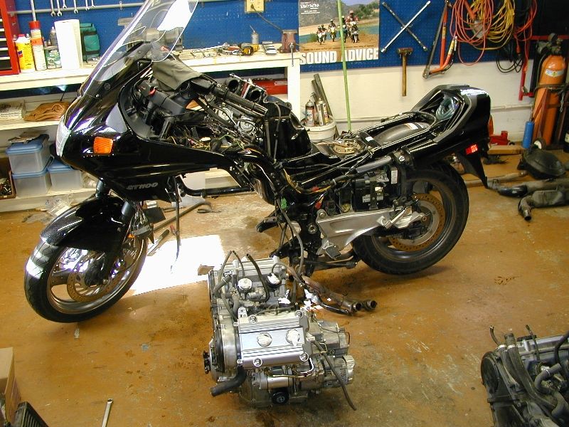 The ST1100 design was refreshed by Honda for model year 1996. One of the most significant improvements was a higher capacity alternator. My 1994 bike had the smaller capacity, older design alternator. The newer unit is air cooled and provides 40 amps or about 550 watts of charging capacity versus 28 amps (390 watts) for the older unit. Plus, the oil cooled units were prone to leak with age and my bike had been weeping oil at the alternator for about a year. The alternator repair/upgrade required removing either the engine or the swing arm from the frame (alternator is visible at the lower left rear of the engine below) and the parts to replace the older unit with the newer one cost about $650. Major work, major cost. So, when I ran across a salvaged 2000 model with only 7K miles on the odometer, I bought the engine, drive shaft, rear drive hub and radiator for a total of $1200. At 103K miles the original engine was still running strong but as my winter project, I replaced the entire drive train and cooling system instead of just the alternator for only a little more money and very little more work. Needless to say it runs like a new bike (since for all practical purposes, it is).